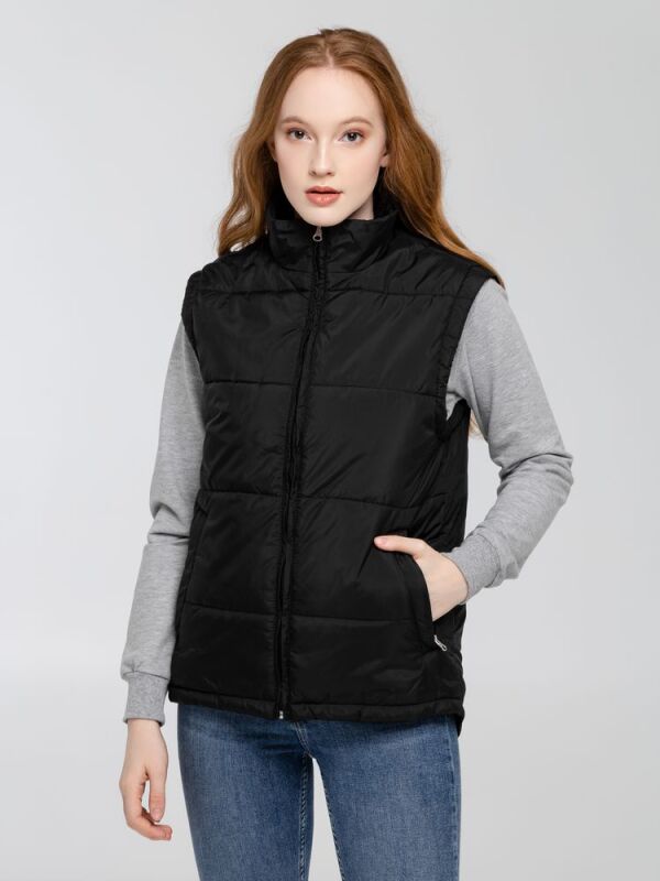 Воротник-стойка, скругленный низ, два наружных кармана на молнии и один внутренний на липучке. Застежка-молния в тон жилета. Для удобства нанесения логотипа можно частично отстегнуть подкладку.