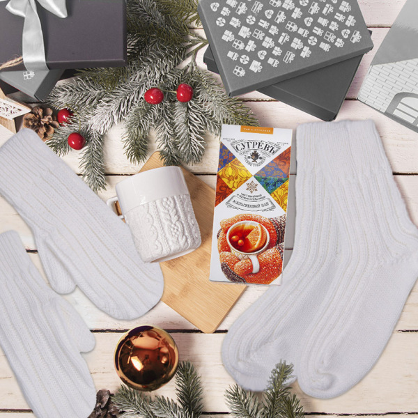 Набор подарочный SNOWFALL: кружка, варежки и носки бренда НАСВЯЗИ©, представленный в оригинальной подарочной упаковке. Идеальным дополнением к набору станет один из чаев серии "СУГРЕВЪ Согревающий". Чай заказывается отдельно!
