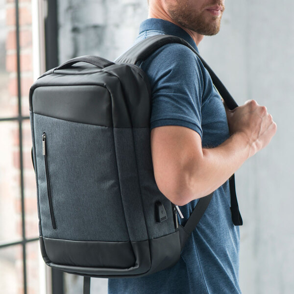 · USB порт для подзарядки вашего устройства (внутри рюкзака расположен кабель для соединения с power bank)